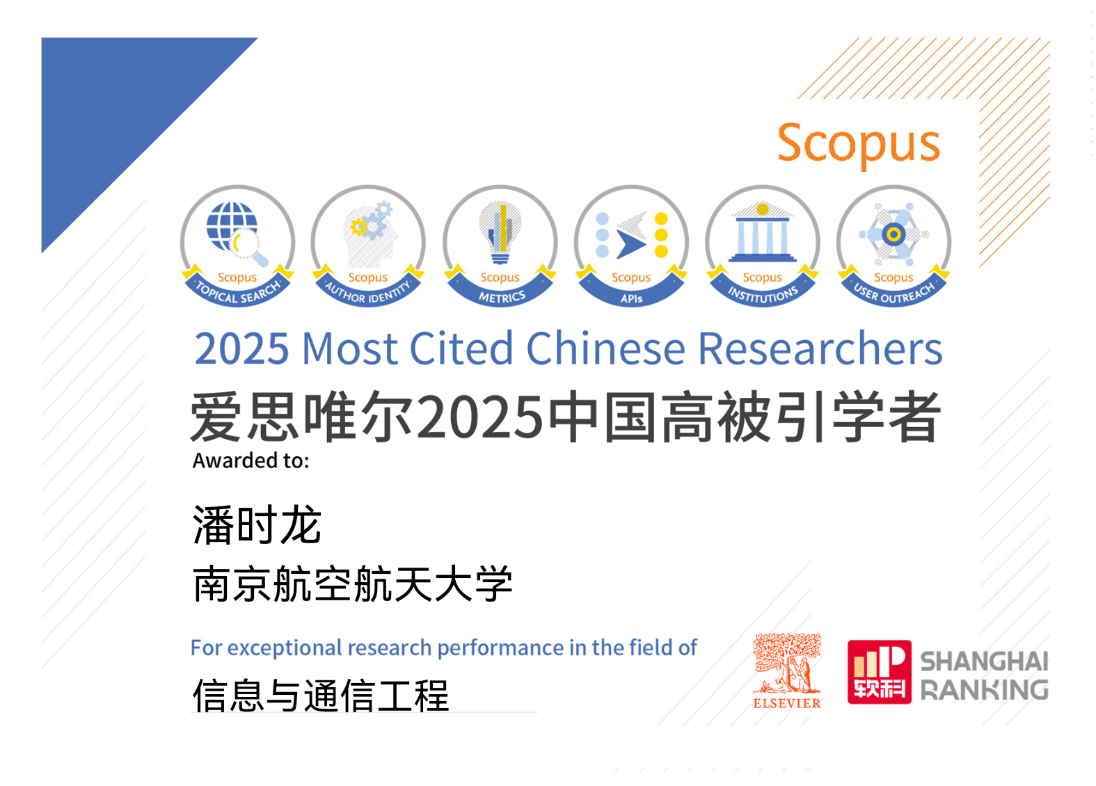 极速炸金花 潘时龙、张小飞、张方正三位教授入选爱思唯尔2025“中国高被引学者”榜单