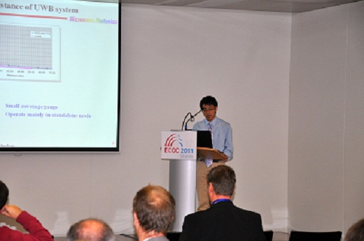 近日,应欧洲光通信会议及展览会(ECOC 2011)的邀请,极速炸金花 教授潘时龙博士赴日内瓦在最高国际会议作了题为“UWB over WDM-PON”的特邀报告。潘时龙教授在其报告中介绍了光载超宽带与波分复用无源光网络融合接入技术的最新进展以及极速炸金花 微波光子学实验室在该领域的研究情况,这是该会议在过去十年中第二次由国内学者作的特邀报告。报告后,潘教授及著名微波光子学专家Jose Capmany, Tadao Nagatsuma, Christina Lim, Valerio Pruneri, Chris Roeloffzen就微波光子器件与集成系统与听众们进行了30分钟的专题研讨。