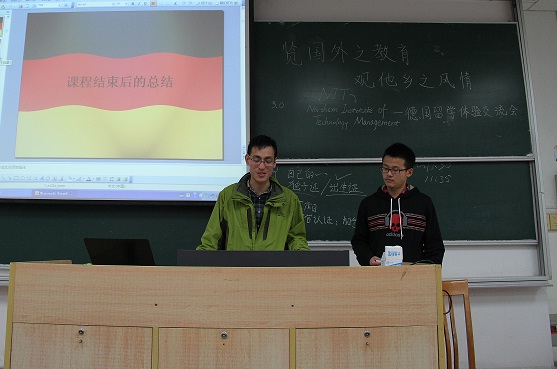 在交流会上,戎星桦、李京效两位同学分别讲述了他们在德国汉堡NIT求学的经历和心得,向大家详细地介绍了出国前申请材料的准备,护照、签证的办理等准备工作,还向同学们讲述了自己在准备过程中遭遇的问题及解决的方法,给大家提供了很好的借鉴。接着,向大家展示了在德国学习过程中的一些照片与视频,介绍了德国大学的教学模式以及德国的交通、旅游、美食等方面的内容,让大家对德国有了更全面的了解。最后,他们给大家提出了一些建议,希望大家在留学过程中能够不怕受挫,充满自信,学会合作,勇于交流。最重要的是要夯实英语水平。