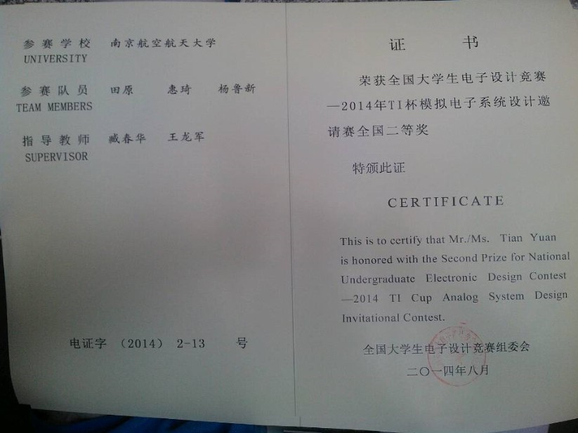 2014年8月26日至29日,2014年全国大学生电子设计竞赛TI杯模拟电子系统设计专题邀请赛在武汉举行。极速炸金花 学子继2012年邀请赛荣获两个二等奖之后,在2014年的比赛再创佳绩。在极速炸金花 臧春华、朱秋明、洪峰老师,校电工电子实验中心的王龙军老师的指导下,参赛的两个队伍全部获奖。其中极速炸金花 田园同学获全国二等奖,霍帅珂和蒋志成同学获全国三等奖。