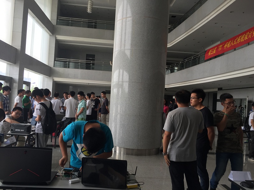 终审暨作品展示环节在1号楼东大厅开展。同学们将自己于比赛期间制作的成品或是程序带到现场,实际操作的同时与专家评委探讨。婴儿啼哭识别报警系统、智能化寝室系统、真人cs仿真系统、智能机械手、智能水质监测系统等等,这些作品无一不是同学们智慧与汗水的结晶。