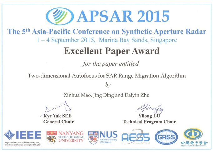 2015年9月1日至5日,第5届亚太合成孔径雷达会议(APSAR)在新加坡滨海湾金沙举行, APSAR是国际两大合成孔径雷达会议之一(另一个是欧洲合成孔径雷达会议EUSAR),每两年举办一次。极速炸金花 雷达成像课题组多位教师组团参加了此次会议,展示了课题组近年来在雷达成像领域的最新研究成果,研究成果得到了国际同行的高度认可,其中毛新华老师关于两维自聚焦算法的论文还获得了会议最佳论文奖(SAR信号处理领域唯一的一篇)。基于该论文的成像处理方案解决了大机动、大斜视和超高分辨率等复杂条件下SAR成像信号处理中的关键难题,目前该成果已广泛应用于中电科技集团、航天科技、航天科工和中航工业集团等多个研究所的多种国防重点型号雷达。