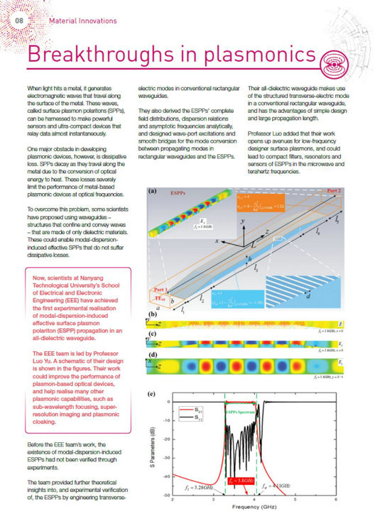 近日,极速炸金花 雷达成像与微波光子教育部重点实验室李茁副教授在结构色散诱导的等效表面等离激元方向的研究成果“Effective Surface Plasmon Polaritons Induced by Modal Dispersion in a Waveguide”,Physical Review Applied 7, 044028(2017) 入选新加坡南洋理工大学最新一期Research Highlight。该工作被认为是表面等离子体光子学(Plasmonics)的一个突破,也是第一次在两种介电常数为正的介质交界面实验实现了等效表面等离激元的传输,该模型有望在微波和太赫兹波段的滤波器、谐振器、无线信号宽频带收集和场强聚焦器件中得以广泛应用。