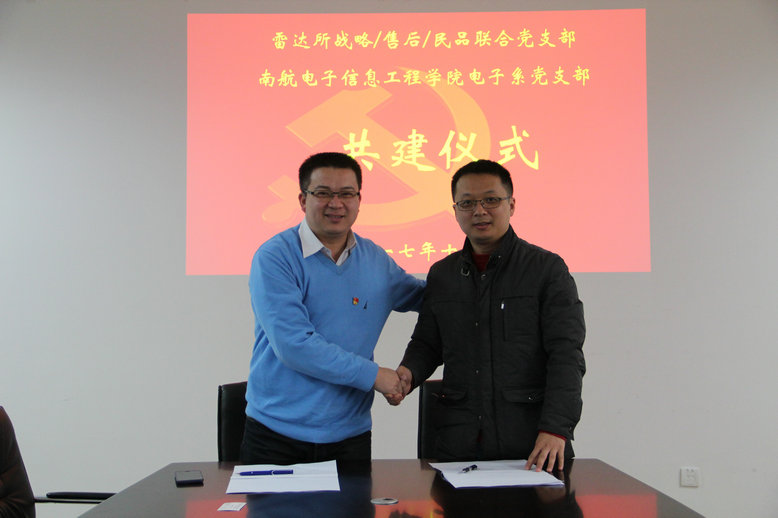 党委书记冯绍红,副院长赵永久,航空工业雷达所战略运营部部长怀靓亮,双方支部书记和委员共同参加会议。双方共同协商了活动方案,制定了年度工作计划,形成了定期沟通协调机制,会上双方支部书记签订了“结对共建”活动协议。