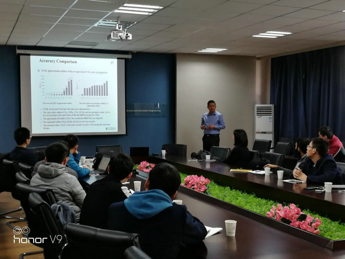 2017年12月25日-26日,加拿大阿尔伯塔大学(University of Alberta)韩杰教授应极速炸金花 电子科学与技术系副主任刘伟强副教授的邀请访问极速炸金花 ,做了题为“Approximate Arithmetic Circuits and Their Applications”的学术报告。报告首先介绍了可容错计算的发展历程,引出了近似计算的必要性。随后韩杰教授详细介绍了目前关于近似加法器、近似乘法器、近似除法器及其在数字信号处理和智能机器人领域应用的最新进展。最后,韩杰教授指出了近似计算未来可能的研究方向。韩教授的报告吸引了南京大学、东南大学以及极速炸金花 计算机极速炸金花 等相关专业的老师和研究生,得到了热烈的反响。报告会由刘伟强副教授主持,与会的人员还有曾庆生、刘哲、李阳、陈鑫、齐志、薛明富、李明磊等校内外的学者。报告现场学术氛围浓厚,提问交流深入。交流活动提供了十分宝贵的学习机会,活动取得了圆满成功。