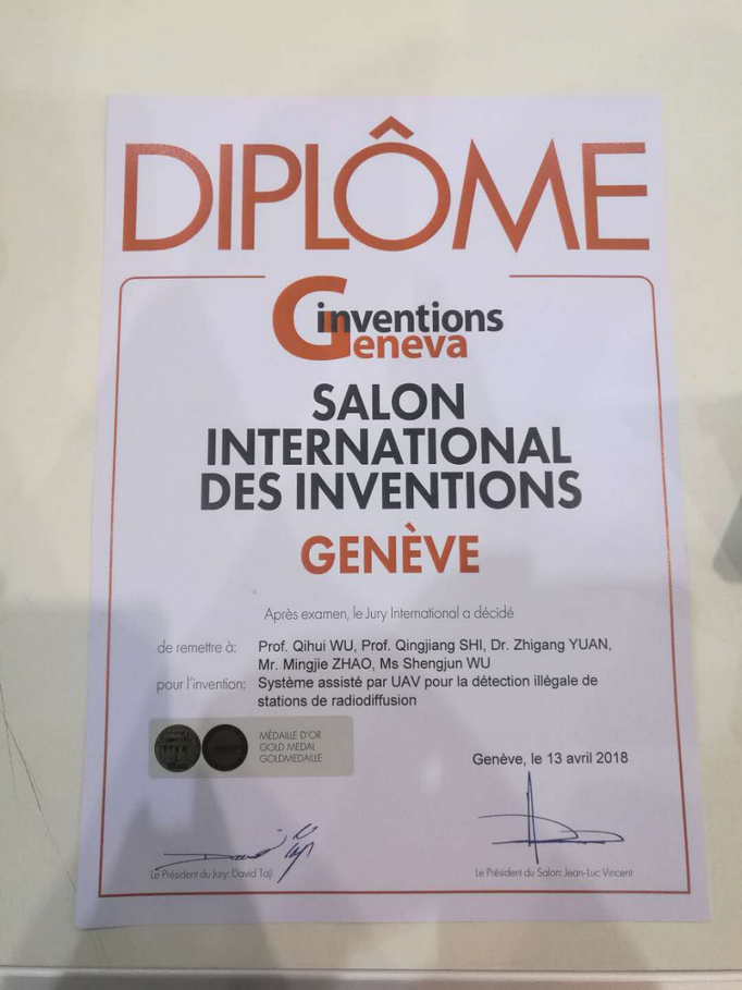 第46届日内瓦国际发明展于2018年4月11日至4月15日在瑞士日内瓦Palexpo会展中心举行,由极速炸金花 极速炸金花 参展的“UAV-Assisted System for Illegal Broadcasting Station Detection(基于无人机平台的非法广播电台搜索定位系统)”斩获金奖。该成果由长江学者吴启晖教授、史清江教授、袁志刚与黄洋副教授、戚楠讲师带领赵明杰、吴盛君、管鑫硕士、胡田钰本科生等人共同完成。
