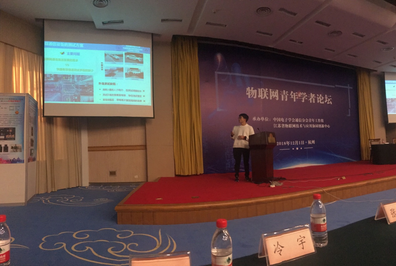 2016级硕士研究生毛开同学作为团队代表,受邀在物联网青年学者论坛上展示获奖作品《面向车联网的电波传播信道半实物仿真系统》并做学术报告。