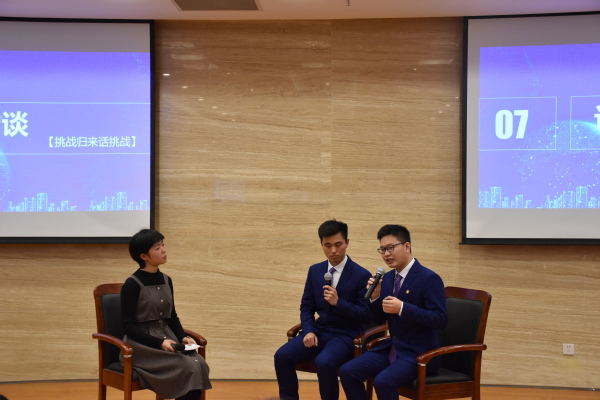 随后,极速炸金花 优秀科创代表卿婷分享了自己的参赛经历与成长历程。极速炸金花 科协工作人员向来宾介绍了极速炸金花 举办的特色科创活动,进行赛事推介。张浩和黄振炎同学则分别介绍了他们参加2019年“挑战杯“全国大学生课外学术科技作品竞赛获特等奖和二等奖的竞赛作品。紧接着进入“挑战归来话挑战”环节,张浩和黄振炎通过访谈形式,将自己参与2019年“挑战杯“全国大学生课外学术科技作品竞赛过程的心路历程与在场同学进行分享,鼓励学弟学妹们参与科创,勇于创新。