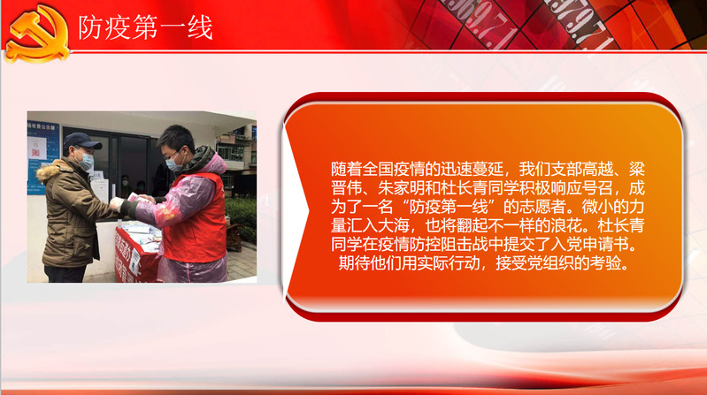 SX1804第一党支部积极分子朱家明、粱晋伟、高越在疫情期间主动到居住地所在社区报到,他们参与宣讲防疫知识、登记信息、夜班值守,配合社区工作人员对居家隔离人员做好后勤保障工作。杜长青同学在抗击疫情第一线提交了入党申请书。一个党员就是一面旗帜,四位同学的志愿经历的分享,