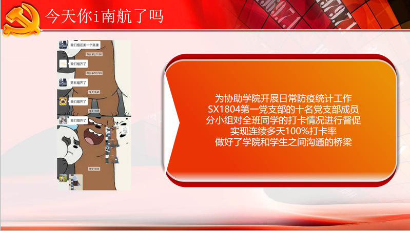 开展日常防疫统计工作,十名党支部成员,两两一组。分小组对全班同学的打卡情况进行督促,做好了极速炸金花