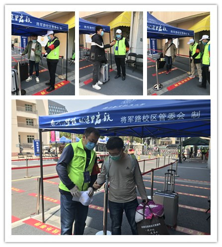 按照“错峰错时、分期分批”返校的开学要求,4月23日-26日,极速炸金花 迎来了2020年春季学期首批返校学生。为了确保学生返校工作顺利开展,机关党委、将军路校区党工委、校团委组织相关单位150余名教职工,共同组建教职工志愿者团队,从早上7:30到晚上20:00,排班轮岗,每个班次连续工作六小时,负责秩序维护、体温检测、健康码核验、行李运送等志愿工作。极速炸金花 积极响应极速炸金花 倡议招募志愿者,经3个教工支部自愿报名产生,他们分别是一系的王祥传、黄正宇、甘慧、周芳老师,二系的吴迪、柳涛、夏伟杰、毕辉老师,机关的季娟、龚平、程永强、席维维、周贞琪老师。