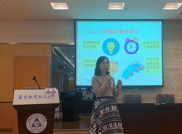 心理委员会的成立背景,组织结构,工作地点,心理咨询预约方式等内容,并对学生心理气象员的工作内容,任职要求,助人技能等内容作了详细描述。针对结合近日多所高校相继发生的研究生自杀事件,陈瑜老师指出,随着科研及课业压力的增加,学生心理问题频发,心理气象员的工作也愈发重要。她强调心理气象员是班级同学的知心伙伴,也是老师和学生之间的信息传递员。心理气象员应该运用所学,培养自身观察和识别心理问题的能力,通过组织心理相关的课余活动加强同学之间的交流,并为同学们提供正确的心理援助渠道信息,做到“自助”和“助人”。