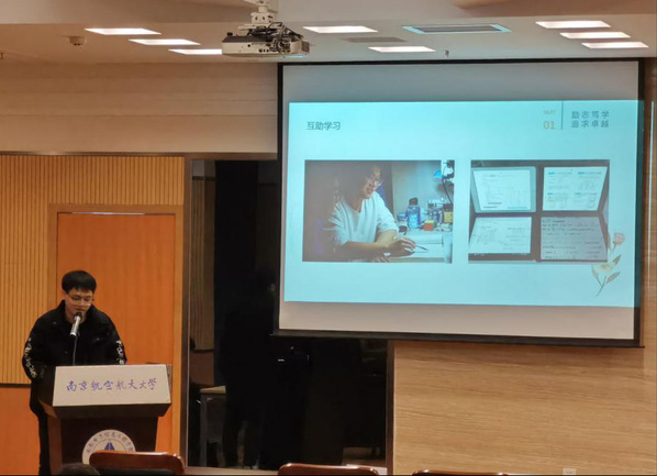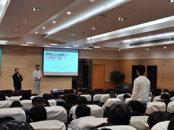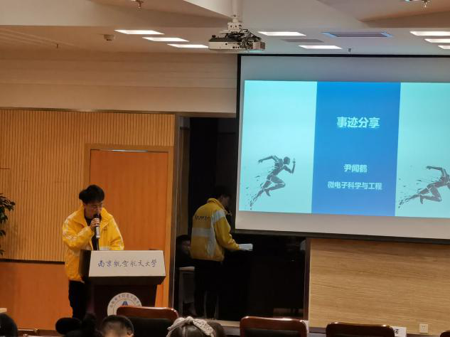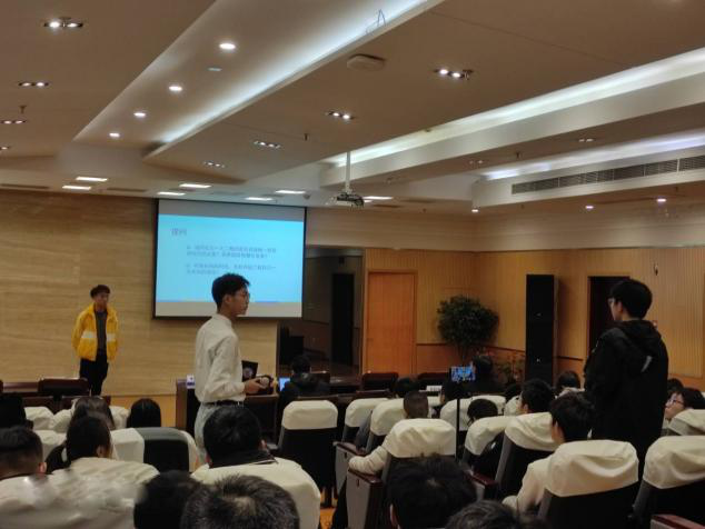 接下来上场的是学院2017级学生尹闻鹤。作为中航技奖学金获得者,从他的讲述中,同学们了解到,他不仅学业优秀,在科创领域也闯出了自己的一片天地。由他主持的大学生智能汽车竞赛项目一路“过关斩将”,在全国决赛中拿到了二等奖。在提问环节,许多大一的同学对科创有着浓厚的兴趣,但是害怕耽误学业和学习冲突而不敢尝试。在尹学长耐心的解释下,同学们心头的困惑消散而去,以学长为榜样向前前行。