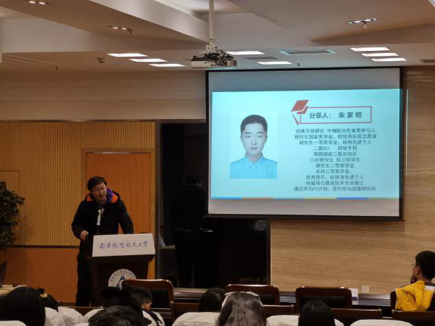 第二位分享的是朱家明同学。作为研究生国家奖学金获得者,结合自身的优异经历,为同学们带来了对于专业与前景的细致解读。他为同学们分析了在专业的选择方面遇到的各种问题与困惑,展示了未来的就业前景。朱家明语重心长地告诉同学们,在人生的任何一个阶段都不能放弃努力,都要一直坚持不懈地提高自己。