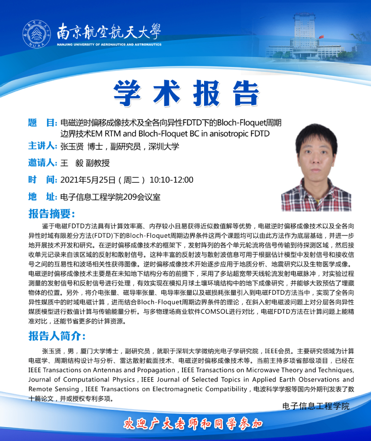 学术报告——电磁逆时偏移成像技术及全各向异性FDTD下的Bloch-Floquet周期边界技术