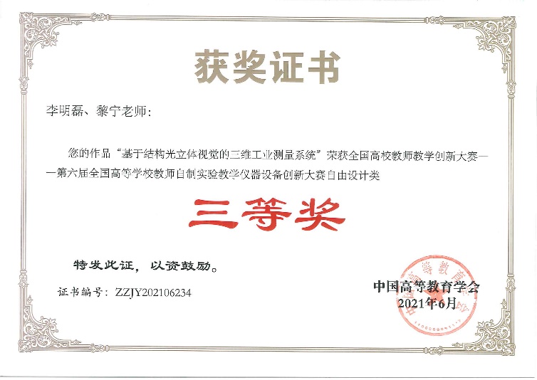 近日,极速炸金花 李明磊、黎宁老师开发的设备作品“基于结构光立体视觉的三维工业测量系统”在全国高校教师教学创新大赛-第六届全国高等极速炸金花 教师自制实验教学仪器设备创新大赛自由设计类中荣获三等奖。全国高校教师教学创新大赛由中国高等教育学会主办,旨在聚焦教学创新、掀起学习革命,全力推进高等教育“质量革命”。