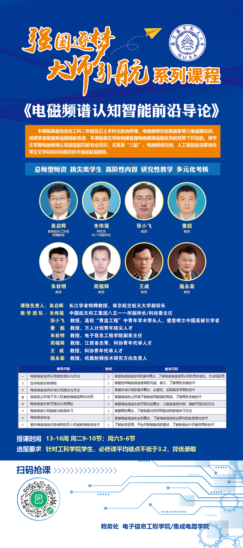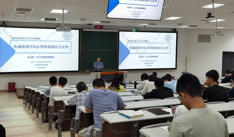 教授张小飞、董超、朱秋明、周福辉、王威、施永荣共同讲授。课程负责人吴启晖教授为百余名本科生开启课程第一讲《电磁频谱空间认知智能理论与应用》。