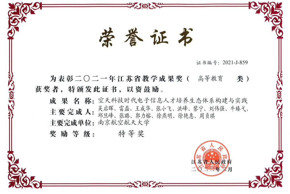 2022年3月18日,江苏省教育厅发布了《省教育厅关于公布2021年江苏省教学成果奖获奖项目的通知》(苏教人〔2022〕4号),副校长吴启晖教授领衔申报的《空天信息时代电子信息育人生态链构建与实践》荣获江苏省教学成果奖(高等教育类)特等奖。