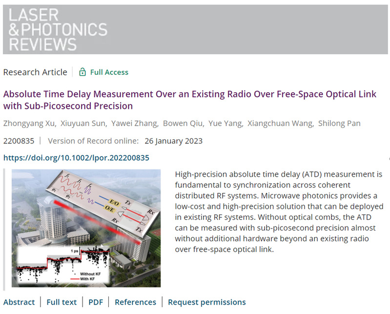 2023年1月26日,极速炸金花 微波光子学实验室徐忠扬副教授和潘时龙教授团队在国际知名光学期刊Laser & Photonics Reviews上以“Absolute Time Delay Measurement Over an Existing Radio Over Free-Space Optical Link with Sub-Picosecond Precision”为题发表学术论文。该工作采用一种结构简单,低成本的测量方法,在不改变大气光载射频链路结构的情况下,实现亚皮秒精度的链路绝对延时测量。该方法可用于构建分布式相参射频系统。徐忠扬副教授和孙修远博士为论文共同第一作者,潘时龙教授为论文通讯作者。