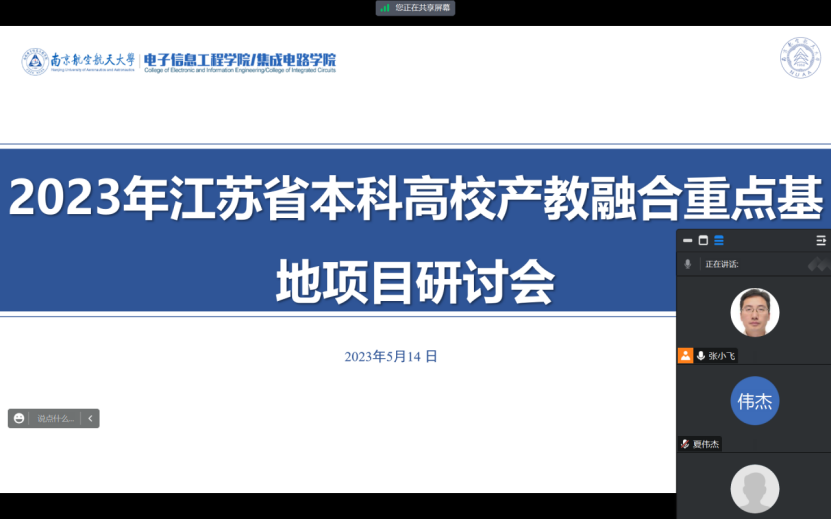 2023年5月14日晚,电子信息极速炸金花 召开2023年江苏省本科高校产教融合重点基地项目线上研讨会,会议由张小飞副院长主持,院长助理夏伟杰、实践教育中心副主任邱旦峰、系专业负责人胡志忠、系科研副主任李明磊、王鹏老师及教学办成员胡欣怡、江菊华共8位老师参加了本次会议。