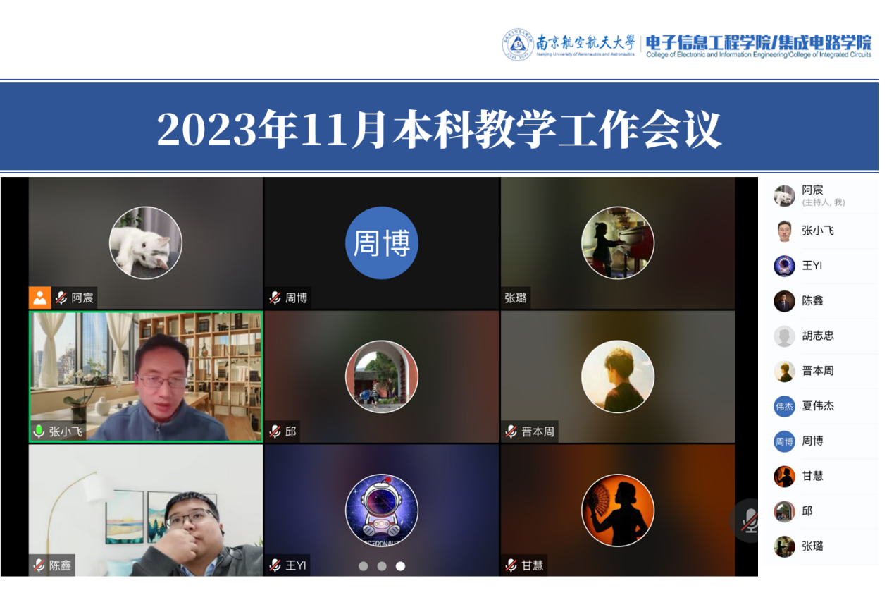 为进一步推进秋季学期本科教学各项重点工作,11月9日晚,电子信息极速炸金花 副院长张小飞带领本科教学工作团队开展期中教学工作会议。院长助理夏伟杰,各系教学副主任王毅、晋本周、陈鑫,专业执行负责人胡志忠、周博,实践教育中心常务副主任甘慧、副主任邱旦峰及极速炸金花 教学办成员参与此次会议。