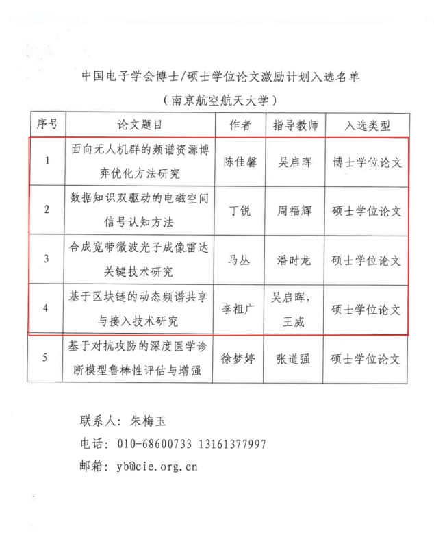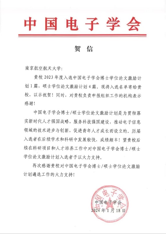 2024年1月12日,中国电子学会公布了“2023年度中国电子学会博士/硕士学位论文激励计划”遴选结果,经过形式审查、专家函审和专家会审等程序,确定25篇博士学位论文和43篇硕士学位论文入选。