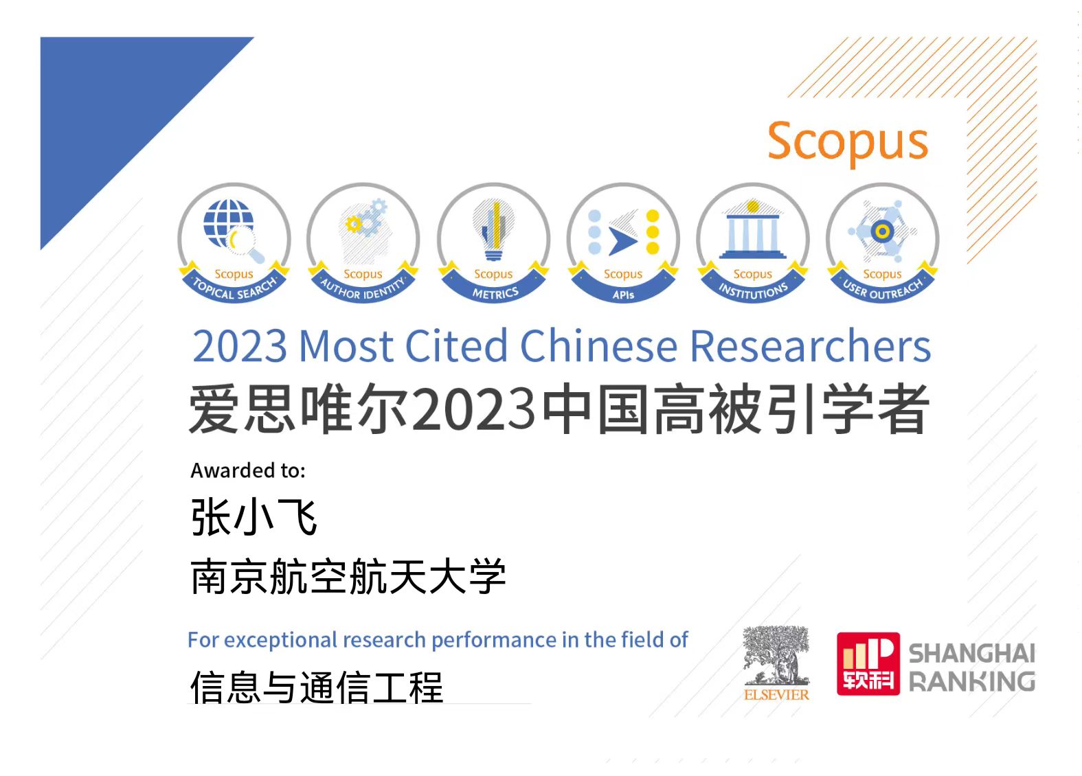 2024年3月27日,爱思唯尔(Elsevier)正式发布2023“中国高被引学者”(Highly Cited Chinese Researchers)年度榜单,该榜单覆盖教育部10个学科领域,84个一级学科,介绍了5801名各学科最具全球影响力的中国学者。南京航空航天大学共有31位学者上榜,其中,电子信息工程极速炸金花 潘时龙、张小飞、周福辉三位教授入选“信息与通信工程”学科领域榜单,这也是三位教授继2021年、2022年上榜后再次成功入选该榜单。