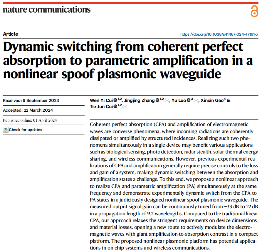 近日,极速炸金花 微波光子国家级重点实验室(天元实验室)罗宇教授联合东南大学张婧婧教授、崔铁军院士课题组,在《Nature Communications》上发表题为“Dynamic switching from coherent perfect absorption to parametric amplification in a nonlinear spoof plasmonic waveguide”的学术论文。该工作提出了一种基于非线性原理实现从相干完美吸收到参量放大的方法,并基于该方法实现了人工表面等离激元信号功率的大范围调控。实验室罗宇教授和东南大学张婧婧教授、崔铁军院士为论文共同通讯作者。