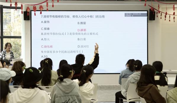 青团制作完毕,一场别开生面的知识竞答拉开帷幕。清明节的历史、青团的制作技艺等问题接连抛出,同学们积极参与,踊跃回答,在一问一答中传承中华优秀传统文化。
