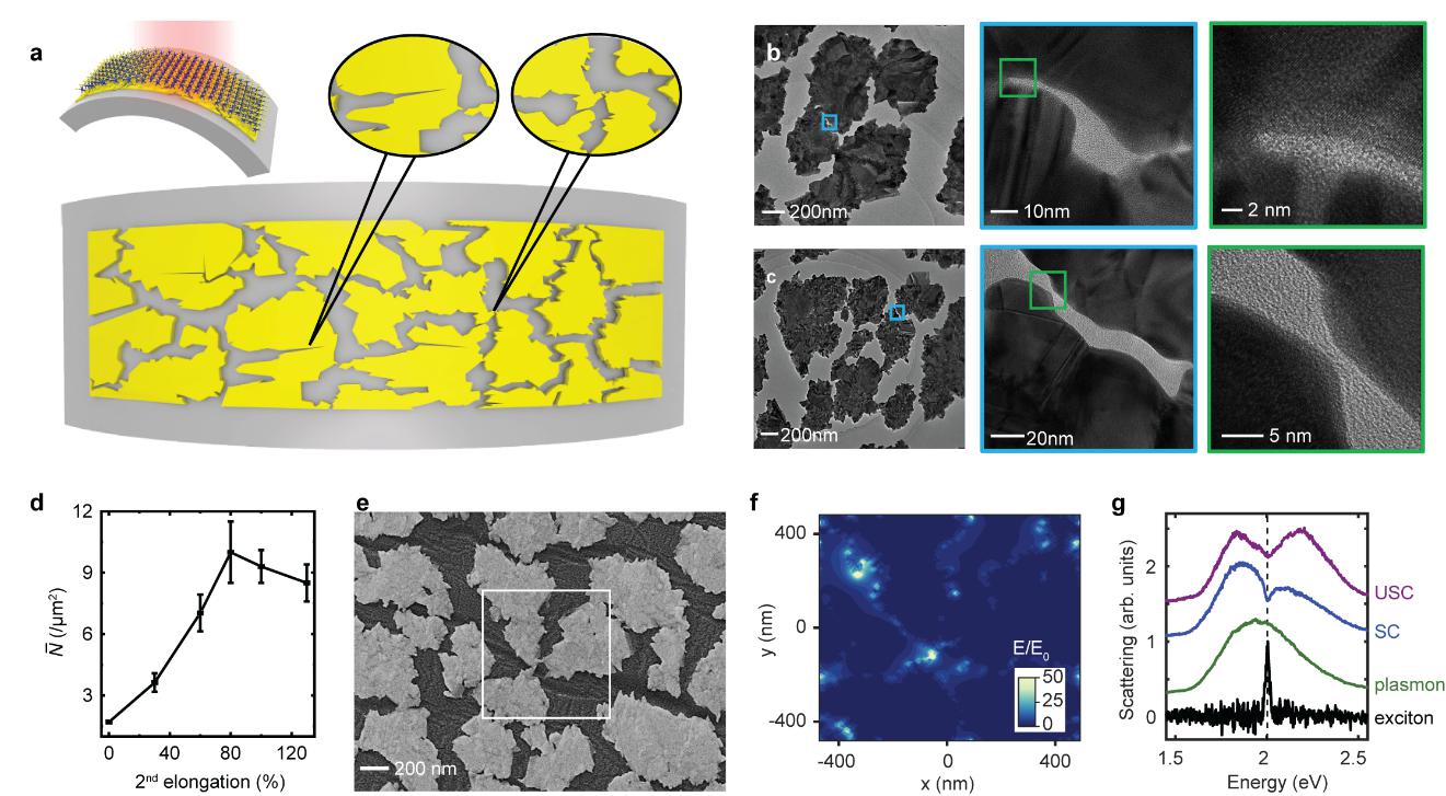图1| WS2单层与随机多奇异等离子激元超表面的超强耦合。a随机多奇异等离子激元超表面的示意图。超表面具有高密度的纳米级等离子激元间隙阵列。左侧插图展示了将机械剥离的WS2单层转移到金超表面之后的结构;中间和右侧的插图展示了生成纳米级间隙的两种主要路径。b、c超表面的透射电子显微镜图像,显示了两种路径制备的纳米级等离子激元间隙。d超表面中每1μm²里包含的纳米级间隙的平均数量随第二次拉伸的变化情况。e 80%的第二次拉伸条件下超表面的扫描电子显微镜图像。尽管纳米级间隙随机分布,但制备的随机多奇异等离子激元超表面保持着“全局均匀性”,即激光束区域内或整个超表面金膜上纳米级间隙的准均匀分布。f间隙等离子激元的近场分布。g WS2单层与不耦合(绿色)和耦合(强耦合为蓝色,超强耦合为紫色)超表面的暗场散射光谱。