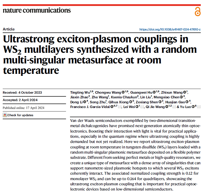 近日,极速炸金花 微波光子国家级重点实验室(天元实验室)罗宇教授联合南洋理工大学王岐捷教授、魏磊教授课题组,以及马德里自治大学Francisco J. Garcia-Vidal教授课题组,在《Nature Communications》上发表题为“Ultrastrong exciton-plasmon couplings in WS2 multilayers synthesized with a random multi-singular metasurface at room temperature”的学术论文。该研究首次成功实现了室温条件下二维材料激子与金属超表面等离子激元之间的超强耦合,并且仅通过施加应力实现了激子-等离子激元耦合强度的大范围调控。实验室罗宇教授和南洋理工大学王岐捷教授、魏磊教授、马德里自治大学Francisco J. Garcia-Vidal教授为论文共同通讯作者。