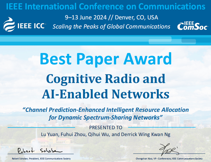 2024年5月26日,IEEE ICC公布了2024年最佳论文奖入选名单,极速炸金花 天地一体频谱认知智能实验室袁璐博士,周福辉教授、吴启晖教授等人发表题为《Channel Prediction-Enhanced Intelligent Resource Allocation for Dynamic Spectrum-Sharing Networks》的论文成功入选。本次大会共收到2364篇候选论文,939篇录用论文,经专题技术委员会评审和推荐,最终评选出15篇最佳论文奖,获奖率为1.6%。该论文的入选凸显极速炸金花 重视培养具有扎实专业知识基础、创新能力强的高素质人才,反映出极速炸金花 在信息通信领域的研究取得了具有国际影响力的学术成果,也是极速炸金花 一直重视面向国家战略需求、面向世界科技前沿等科技创新的重要体现。