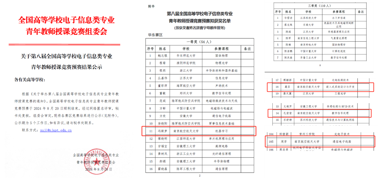 共有4名参赛教师获奖,其中冯斯梦老师主讲课程《机器学习》获华东赛区一等奖,葛芬老师主讲课程《嵌入式系统设计与开发》获华东赛区三等奖,周芳老师主讲课程《通信电子线路》获华东赛区三等奖,孔莹莹老师主讲课程《数字信号处理》获华东赛区三等奖。根据赛事安排,华东赛区一等奖获得者冯斯梦取得决赛资格,将于2024年10月19日前往中国计量大学参加竞赛决赛,角逐全国奖项。