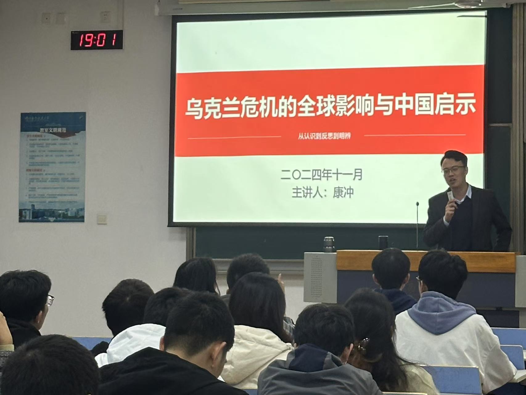 康冲以“乌克兰危机的全球影响与中国启示”为主题做专题培训。他从俄乌冲突的始末讲起,并深入阐释了中方的立场及应对举措。他表示,面对复杂的国际局势和俄乌冲突所引发的全球挑战,中国坚持共同、综合、合作、可持续的全球安全观,倡导平衡公正对待各国的安全关切与安全倡议,并呼吁通过对话与协商化解分歧。他还讲道,乌克兰危机也给中国在带来了启示——中国需要在政治、经济、外交和科技等方面实现自立自强,要坚定不移地走中国特色社会主义道路,坚持创新驱动发展和真正的多边主义,提升自主创新能力。