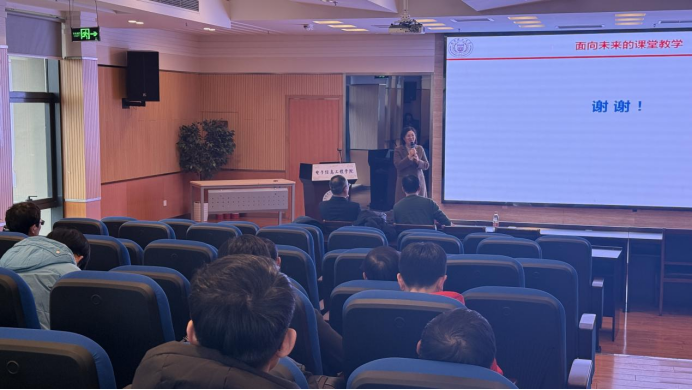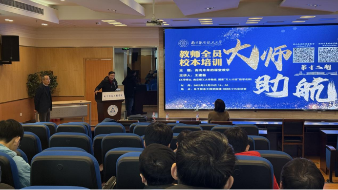 12月25日,国家“万人计划”教学名师、南京理工大学王建新教授来访电子信息工程极速炸金花 ,为青年教师作题为“面向未来的课堂教学”的“大师助航”特邀报告。教师发展与教学评估中心副主任杨兰芳、电子信息工程极速炸金花 教学副院长张小飞、各极速炸金花 教师代表共计50余人参加本次讲座。讲座由副院长张小飞主持。