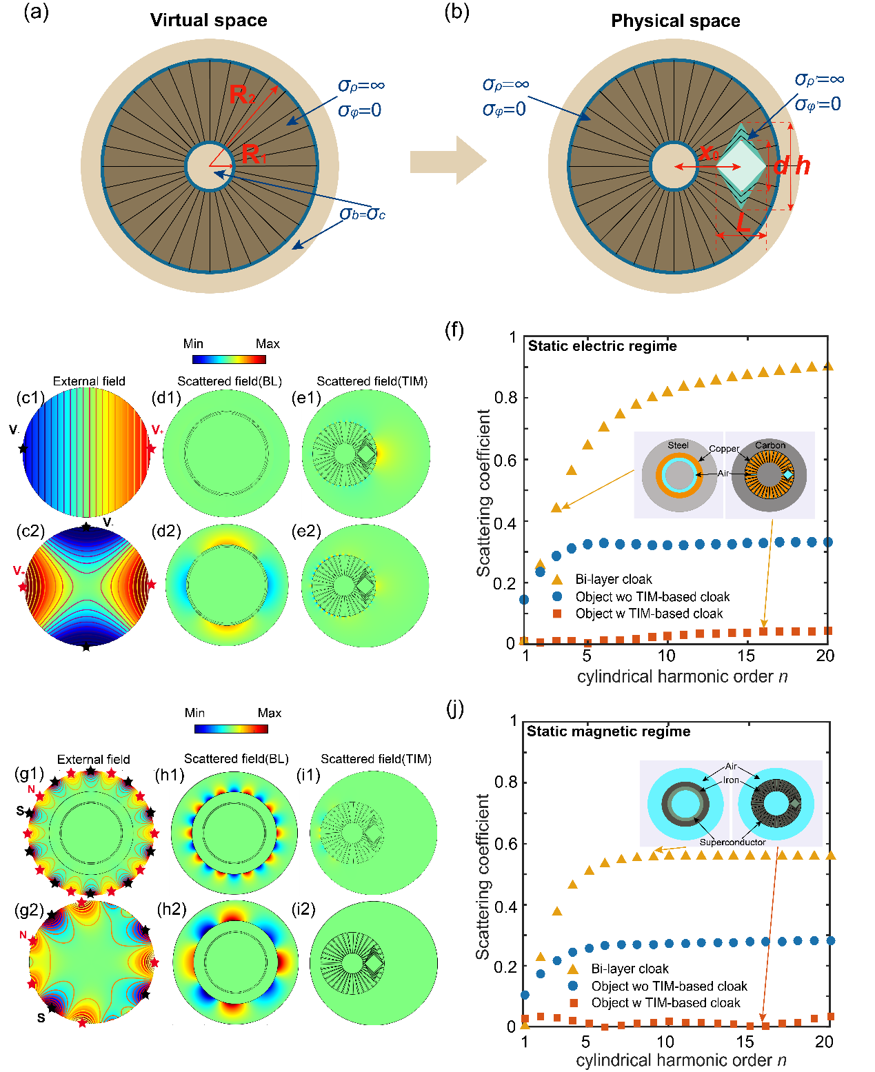 下图展示了基于TIM的隐身衣的设计与工作原理。在传统隐身斗篷中,材料的电磁属性与背景介质密切相关,导致其强烈的背景依赖性。而TIM具有独特的物理特性,其介电常数和磁导率在任意坐标变换下保持不变。基于这一特性,TIM能够有效地解耦隐身衣的材料物理性质与背景介质,从而为解决背景依赖性问题提供了全新的理论框架。TIM的结构设计基于堆叠不同材料层(如铜和空气),以实现强各向异性材料的特性。通过合理安排材料层的排列方向,能够确保隐形效果的实现。基于这一设计,本研究成功实现了一种理想的静电场隐身衣。通过仿真计算与近场测量结果表明,该隐身斗篷能够在背景电导率从22至859 kS·m−1的变化范围内保持稳定的隐身效果。此外,研究还验证了该隐身斗篷在不同圆柱谐波阶数的背景场条件下,以及在三维隐身衣设计中对背景变化免疫的效应。这一方法不仅适用于电场,还能够扩展到静态磁场和热扩散等多个领域,在多种应用场景中实现有效的目标隔离。研究结果表明,该技术具有广泛的应用前景和潜力,能够突破传统隐身技术的局限,解决背景依赖性问题,为隐身技术在更加多样化应用场景中的实现奠定理论基础。