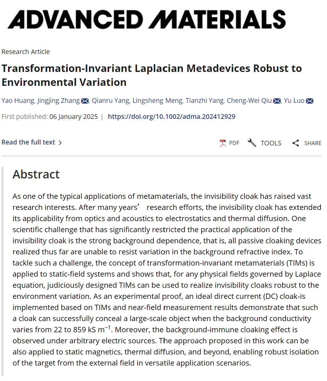 近日,极速炸金花 极速炸金花 (天元实验室)罗宇教授团队联合新加坡国立大学仇成伟教授,以及东南大学张婧婧教授课题组,在《Advanced Materials》上发表题为“Transformation-Invariant Laplacian Metadevices Robust to Environmental Variation”的学术论文。该研究提出并实验实现了一种基于强各向异性超材料(TIM)的隐形技术,成功克服了传统隐身技术在复杂环境中面临的关键挑战,为隐身斗篷技术的实际应用提供了全新的思路。实验室罗宇教授为第一通讯作者,极速炸金花 为第一通讯单位。