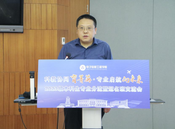 2025年4月26日,电子信息工程极速炸金花 以“科教协同育菁英·专业启航向未来”为主题,在天目湖校区巡天楼二楼报告厅召开2023级本科生专业分流暨冠名班交流会。极速炸金花 副院长张小飞、院长助理牛臻弋及多位教师代表出席,为2023级本科生搭建专业认知与发展规划的交流平台。