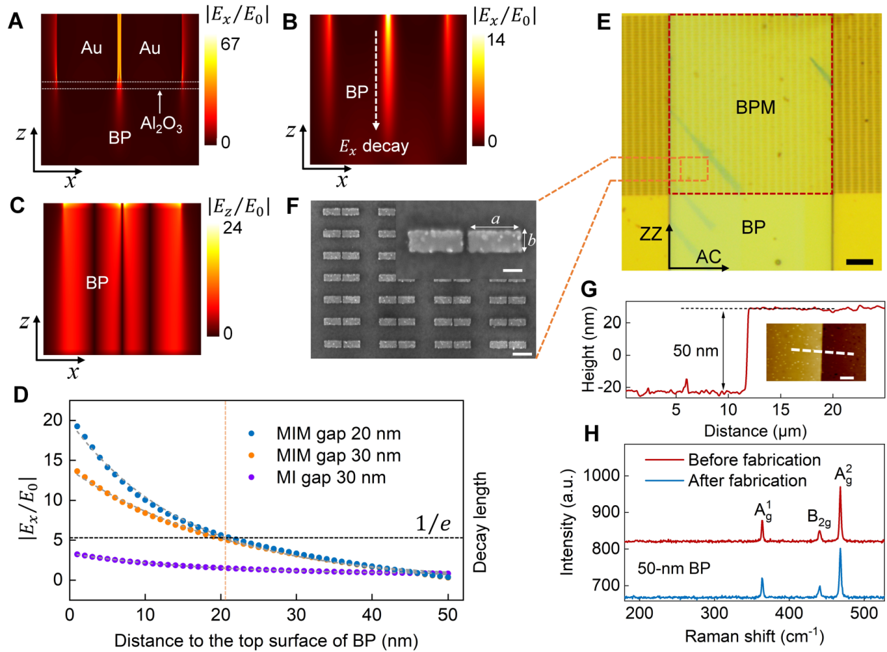 尽管黑磷性能卓越,其原子级厚度仍限制了光-物质相互作用。为此,团队创新性地设计了黑磷混合等离子体超表面(BPM)。该结构由三部分组成:底部150 nm金反射层、含黑磷的介质层(覆盖7 nm氧化铝保护层)以及顶部金纳米天线阵列。通过精确调控天线尺寸(长度480 nm、宽度198 nm)与间隙(30 nm),超表面在中红外波段激发局域表面等离子体共振,将光场压缩至纳米尺度。