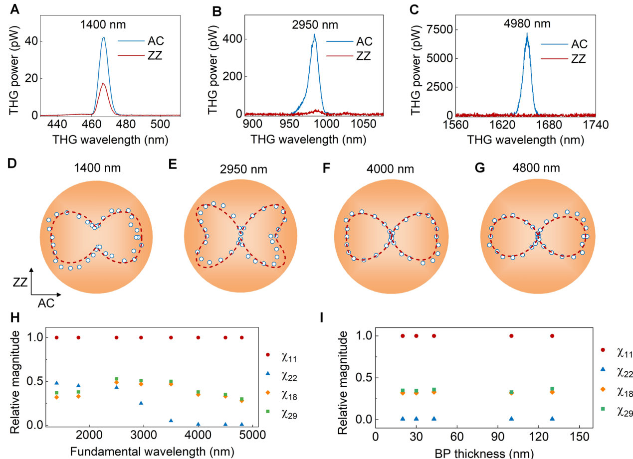 黑磷的晶体结构赋予其强烈的光学各向异性,而这一特性在超表面加持下被推向极致。实验发现,当激发光偏振沿黑磷的AC方向时,THG强度较ZZ方向增强50倍(3500 nm)。这种“极端偏振选择性”源于其三阶非线性张量的主导分量χ₁₁(对应AC方向),而ZZ方向的分量χ₂₂在长波长下几乎可忽略。研究团队进一步通过角度分辨THG测量,重构了χ₁₁、χ₁₂和χ₂₂的波长依赖性,揭示了多光子共振对张量分量演化的调控机制。这一发现为开发偏振敏感的光子器件(如定向光开关或各向异性探测器)提供了理论基石。
