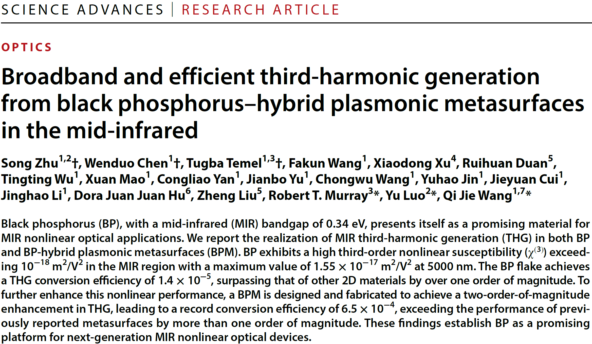 近日,极速炸金花 电子信息工程极速炸金花 罗宇教授团队联合新加坡南洋理工大学王岐捷教授和伦敦帝国理工极速炸金花 Robert T. Murray教授在国际顶刊《Science Advances》上发表了一项突破性研究成果,成功利用黑磷(Black Phosphorus, BP)及其混合等离子体超表面(BPM),在中红外波段实现了宽带高效的三次谐波生成(Third-Harmonic Generation, THG),其转换效率创下历史新高。这一突破不仅填补了中红外非线性光学材料的性能空白,更为下一代超快光子器件、频率转换技术及集成光子学开辟了全新路径。王岐捷教授、罗宇教授和Robert T. Murray教授为该论文的通讯作者;极速炸金花 朱松教授为论文的第一作者。