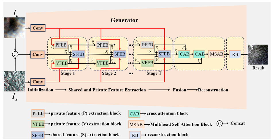 王鹏副教授指导博士研究生何忠臣与朱岱寅教授、香港大学黄波教授等合作发表的论文“DADIGAN: A Dual Attention Blocks-Based Disentangled Iterative Generative Adversarial Network for Cloud and Shadow Removal on SAR and Optical Images”被IF接收,该论文针对现有光学和SAR图像融合去云方法无法充分利用多模态遥感影像的共享特征和私有特征以及特征提取过程缺乏可解释性等挑战,提出一种基于双注意块的解缠结迭代生成对抗网络去除光学图像中的云和阴影。在两个大型的公开数据集上的结果表明,我们提出的方法在不同地表覆盖类型以及不同程度的云层和阴影覆盖下均能提供卓越的视觉效果和定量评估。该方法的主干网络结构如下所示: