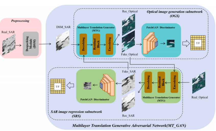 王鹏副教授指导博士研究生陈永康与朱岱寅教授、香港大学黄波教授以及法国格勒诺布尔理工极速炸金花 Jocelyn Chanussot教授合作发表的论文“MT_GAN: A SAR-to-optical image translation method for cloud removal”被ISPRS接收,该论文结合了SAR能够穿透云层、降雨和雾以及光学图像包含丰富光谱信息的优势,针对SAR图像中的散斑噪声和光学图像在云层覆盖下往往难以观测的问题。提出一种基于多层翻译生成对抗网络(MT_GAN)的云去除方法。并且在4个数据集上进行实验,其中2个用于图像翻译实验,另外2个用于去云实验。结果表明,我们所提出的方法在无论是在客观评价指标层面还是主观可视化图像展示层面,都能达到优质的效果,并可以有效地去云。该方法的主干网络结构如下所示: