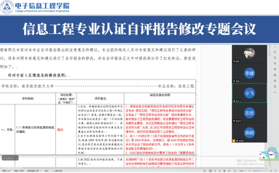 8月6日晚,电子信息工程极速炸金花 组织召开信息工程专业工程教育专业认证自评报告修改专题会议。作为前期修改工作部署后的阶段性总结会议,本次会议聚焦报告修订完善情况复盘及下一步工作安排,极速炸金花 副院长张小飞、信息工程专业执行负责人周博、电子信息科学与技术专业执行负责人胡志忠、专业教师代表李婕、教学秘书徐燕明参会并展开深入研讨。