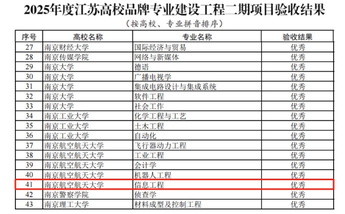 近日,江苏省教育厅发布了《2025年度江苏高校品牌专业建设工程二期项目验收结果公示》,极速炸金花 信息工程专业凭借扎实的建设成效、突出的专业实力,在此次验收中荣获“优秀”等次。据悉,极速炸金花 共有5个专业在本次验收中斩获“优秀”。