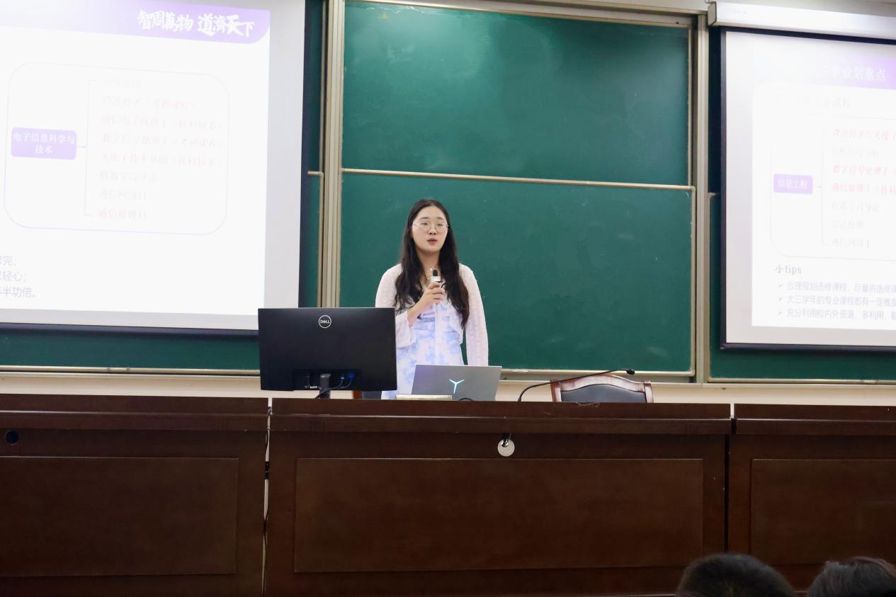 张竞文以本专业直系学姐的身份从学业发展角度进行大三年级的专业课学习和升学经验分享,重点强调大三阶段课程难度显著提升、学分比重大,对后续升学规划具有重要影响,建议同学们扎实掌握专业知识、科学安排选修课程、善用校内外资源,并提前关注考研相关课程内容。