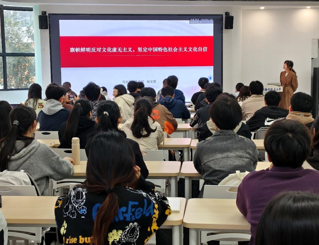 集成电路极速炸金花 思政专员、马克思主义极速炸金花 张文君老师主讲《旗帜鲜明反对文化虚无主义,坚定中国特色社会主义文化自信》。她从“文化虚无主义”的叙事方法出发,结合现实案例深入剖析文化虚无主义的现实表现与深层危害,明确指出其错误本质与消极影响。她引导学员们要增强防范意识与辨别能力,自觉抵制文化虚无主义,牢固树立中国特色社会主义文化自信。