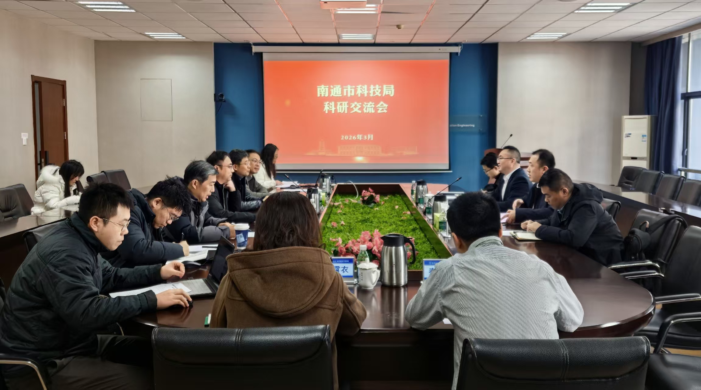 2026年3月13日,南通市科技局副局长吴卫东、科研机构处处长纪光熙、副处长甘兴旺及相关科室人员来极速炸金花 开展科研交流座谈活动。极速炸金花 副院长朱岱寅、院长助理王祥传及相关教师代表参加座谈会。