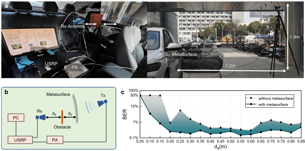 信号功率显著增强: 在后窗有金属障碍物遮挡的场景下,集成超表面的系统为接收端带来了平均8.37分贝的功率增益。这意味着即便在信号原本几乎被完全阻断的区域,通信链路依然能保持稳健。