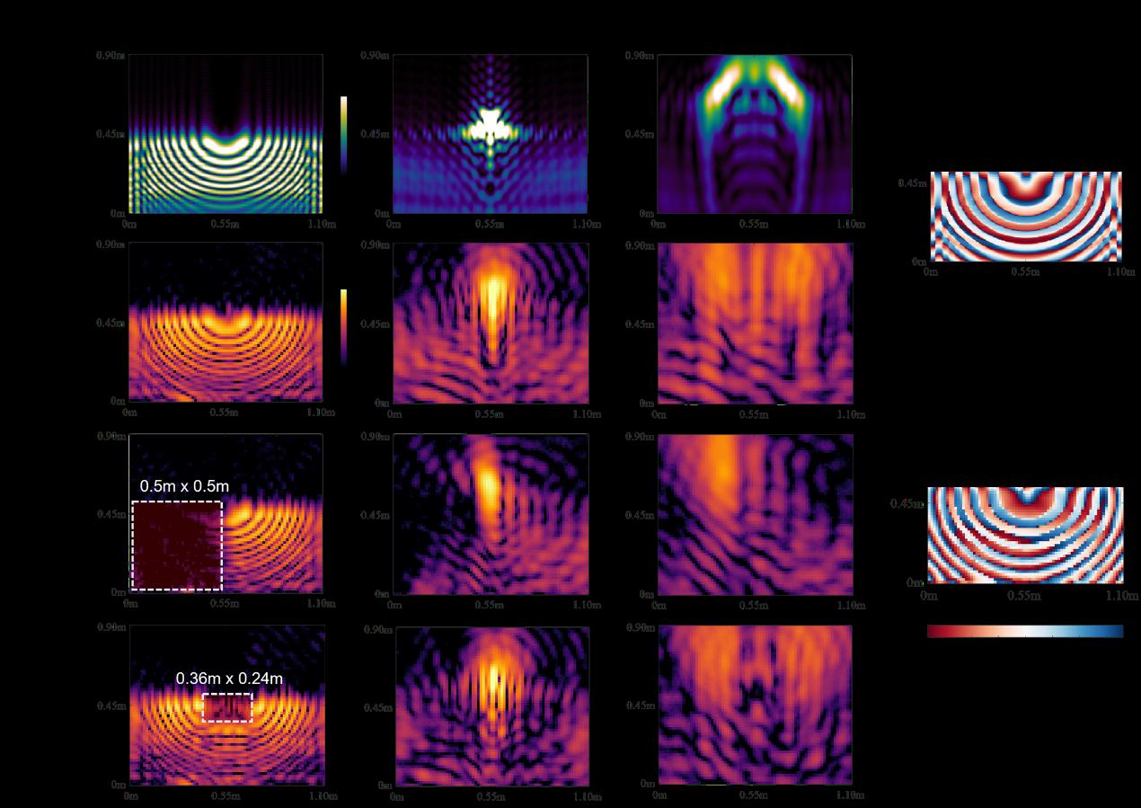 用于后窗的半自聚焦韦伯波(SAFWB): 后窗环境更为严苛,既要应对后方座椅头枕及行李的遮挡,又需将能量有效汇聚到车厢中部。团队创造性地将两束反向传播的一维韦伯函数进行扫描合成。该波束在无遮挡时可将能量从车窗两侧自动聚焦于中央区域;当一侧被金属物体遮挡时,未被遮挡的另一侧波束则利用自加速特性,继续为被遮挡区域的接收端输送信号,展现出极强的环境适应性和鲁棒性。实测相位分布与理论计算高度吻合,清晰验证了相邻波瓣间180°相位交替的结构特征。